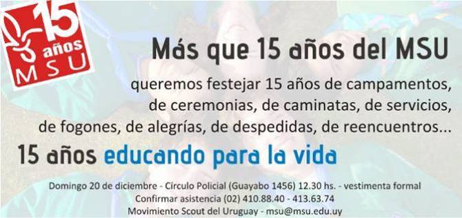 20 dic – 12:30 hs – Más que 15 años del Movimiento Scout del Uruguay Publicado el diciembre 18, 2009 por Vida y Educación Comparte esto: Compartir en LinkedIn (Se abre en una ventana nueva) LinkedIn Comparte en Facebook (Se abre en una ventana nueva) Facebook Imprimir (Se abre en una ventana nueva) Imprimir Enviar un enlace a un amigo por correo electrónico (Se abre en una ventana nueva) Correo electrónico Me gusta Cargando... Relacionado
