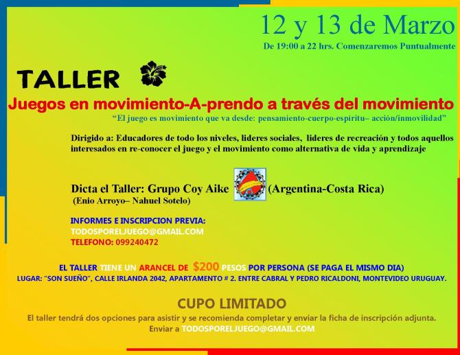 100312 – 12 mar – Taller «Juegos en movimiento -A-prendo a través del movimiento» Publicado el febrero 25, 2010 por Vida y Educación Comparte esto: Compartir en LinkedIn (Se abre en una ventana nueva) LinkedIn Comparte en Facebook (Se abre en una ventana nueva) Facebook Imprimir (Se abre en una ventana nueva) Imprimir Enviar un enlace a un amigo por correo electrónico (Se abre en una ventana nueva) Correo electrónico Me gusta Cargando... Relacionado