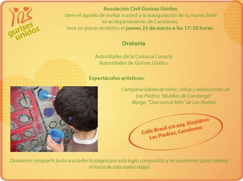 100325 – 25 mar 17:30 hs – Gurises Unidos inaugura sede en Canelones Publicado el marzo 11, 2010 por Vida y Educación Comparte esto: Compartir en LinkedIn (Se abre en una ventana nueva) LinkedIn Comparte en Facebook (Se abre en una ventana nueva) Facebook Imprimir (Se abre en una ventana nueva) Imprimir Enviar un enlace a un amigo por correo electrónico (Se abre en una ventana nueva) Correo electrónico Me gusta Cargando... Relacionado