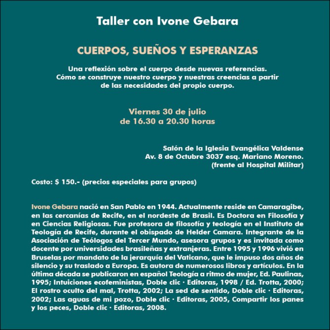 Les recordamos la invitación al taller que la filósofa y teóloga brasileña Ivone Gebara coordinará en Montevideo.