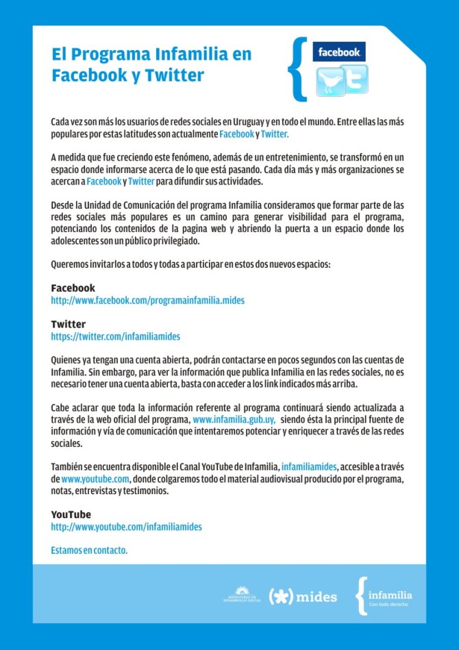 Desde la Unidad de Comunicación del programa Infamilia-MIDES consideramos que formar parte de las redes sociales más populares es un camino para ganar visibilidad abriendo la puerta hacia un espacio donde los adolescentes son un público privilegiado. Invitamos a todos y todas a sumarse a esta nueva vía de comunicación con Infamilia.