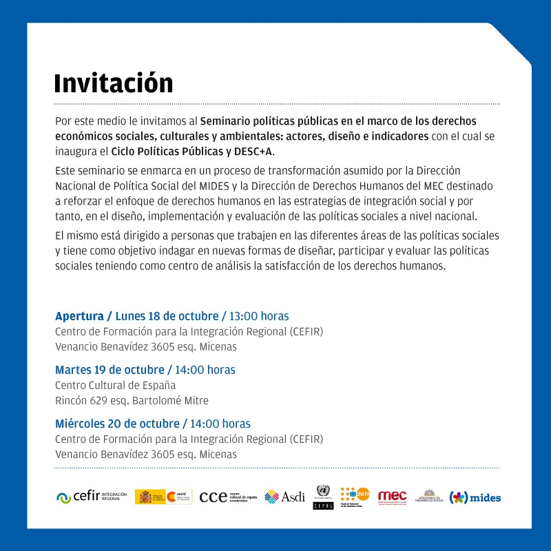 Por este medio les invitamos al Seminario políticas públicas en el marco de los derechos económicos, sociales, culturales y ambientales: actores, diseño e indicadores, con el cual se inaugura el Ciclo Políticas Públicas y DESC+A el próximo Lunes 18 de octubre a las 14 horas.SE ADJUNTA PROGRAMA E INVITACIÓN