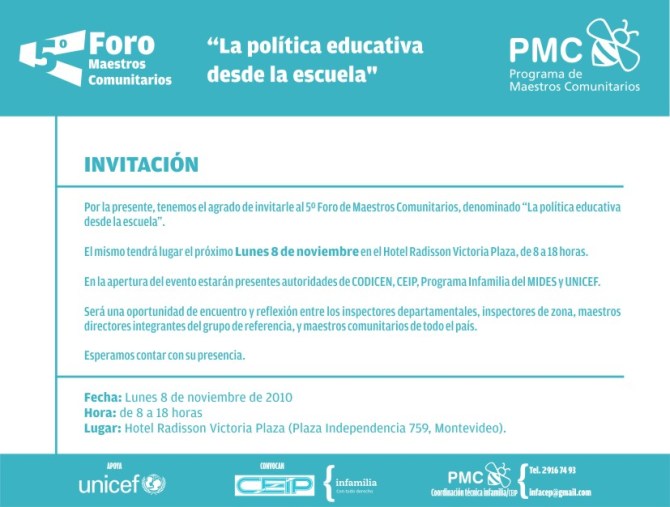 101108 – 8 noviembre, de 8 a 18 hs – Foro Maestros Comunitarios: “La política educativa desdela escuela”