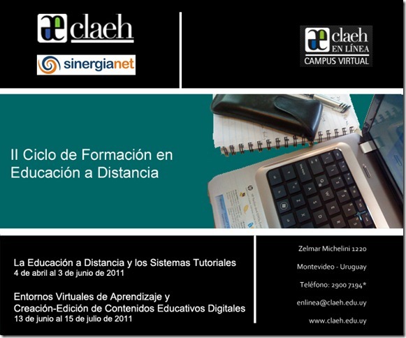 EL CLAEH y Sinergia.net invitan a docentes y capacitadores a participar del II Ciclo de Formación en Educación a Distancia. Los procesos, las herramientas y las metodologías de la educación a distancia con uso de TIC (tecnologías de información y comunicación) son los pilares de estos cursos.