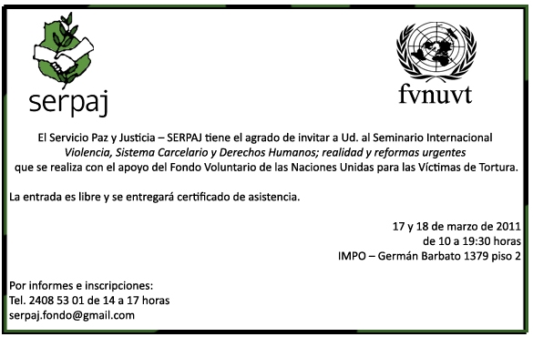 El Servicio de Paz y Justicia (SERPAJ) con el apoyo del Fondo Voluntario de Naciones Unidas para las Víctimas de la Tortura, está organizando el Seminario: Violencia, Sistema Carcelario y Derechos Humanos: realidad y reformas urgentes.
