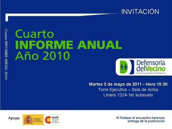 El próximo Martes 3 de mayo, a la hora 15.30 en la Sala de Actos de la Torre Ejecutiva (Liniers 1324 – Primer subsuelo) se realizará la Presentación y entrega del IV Informe Anual de la Defensoría del Vecino de Montevideo.