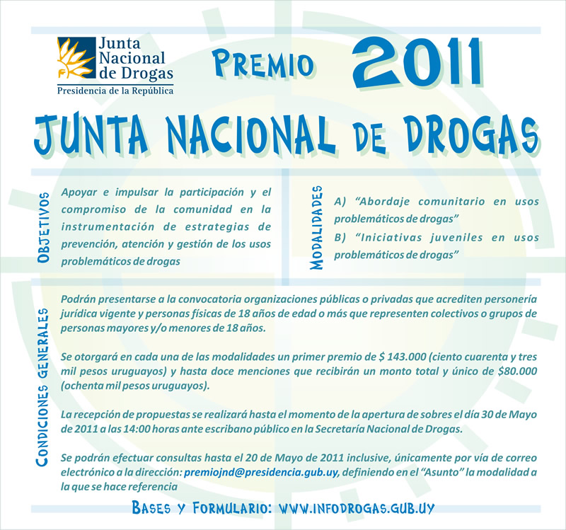 110530 – hasta 30 mayo – Convocatoria Premio 2011 Junta Nacional de Drogas Publicado el mayo 5, 2011 por Vida y Educación Bases del llamado: http://www.box.net/shared/970rvjrs5f Formulario Intervenciones jóvenes: http://www.box.net/shared/ikeqyntj01 Formulario Abordaje Comunitario: http://www.box.net/shared/25ubmoaxmd Comparte esto: Haz clic para compartir en LinkedIn (Se abre en una ventana nueva) LinkedIn Haz clic para compartir en Facebook (Se abre en una ventana nueva) Facebook Haz clic para imprimir (Se abre en una ventana nueva) Imprimir Haz clic para enviar un enlace por correo electrónico a un amigo (Se abre en una ventana nueva) Correo electrónico Me gusta Cargando... Relacionado