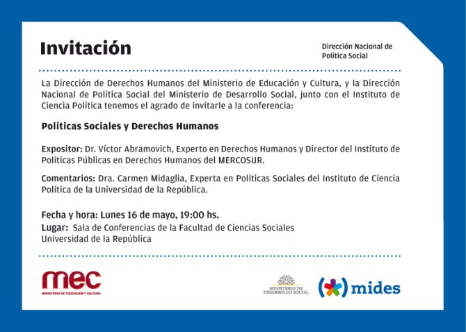 Desde la Dirección Nacional de Derechos Humanos del Ministerio de Educación y Cultura, junto con el Instituto de Políticas Públicas de Derechos Humanos del Mercosur y la Dirección Nacional de Política Social del Ministerio de Desarrollo Social, convocamos a todos a participar de la Conferencia: Políticas Sociales y Derechos Humanos, a realizarse el 16 de mayo a las 19.00 horas en la Sala de Conferencia de la Facultad de Ciencias Sociales. El expositor será el Dr. Víctor Abramovich, experto en derechos humanos.