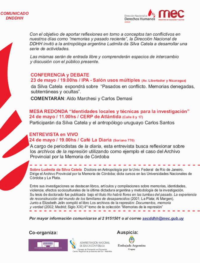110523 – 23 y 24 mayo – Actividades DDHH con Ludmila da Silva Catela Publicado el mayo 16, 2011 por Vida y Educación Comparte esto: Compartir en LinkedIn (Se abre en una ventana nueva) LinkedIn Comparte en Facebook (Se abre en una ventana nueva) Facebook Imprimir (Se abre en una ventana nueva) Imprimir Enviar un enlace a un amigo por correo electrónico (Se abre en una ventana nueva) Correo electrónico Me gusta Cargando... Relacionado
