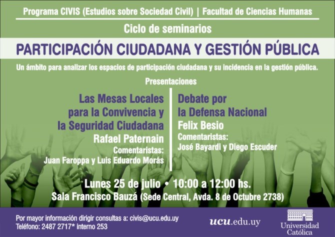 Les estoy enviando una invitación para un seminario que estaremos realizando el próximo lunes 25 de julio a las 10 horas en el marco del ciclo «Participación Ciudadana y Gestión Pública». Las iniciativas de participación ciudadana y su incidencia en la gestión pública constituyen uno de los temas centrales de análisis del programa CIVIS de la Universidad Católica, una iniciativa orientada al estudio de las relaciones Estado – Sociedad Civil y sus transformaciones recientes en la sociedad uruguaya. Este seminario es el primero de una serie de encuentros en los que estaremos analizando una compilación de trabajos académicos que formarán parte de una publicación sobre esta temática. En esta oportunidad estaremos presentando los trabajos sobre las Mesas Locales de Convivencia y Seguridad Ciudadana y el Debate por la Defensa Nacional, preparados por Rafael Paternain y Félix Besio, respectivamente. Con el objetivo de enriquecer los documentos realizados por los autores, los mismos serán comentados por especialistas y luego abriremos un espacio para comentarios del público asistente. La actividad es abierta y está especialmente dirigida a quienes estén interesados en el análisis de los espacios de participación ciudadana y su incidencia en la toma de decisiones y diseño de las políticas públicas.