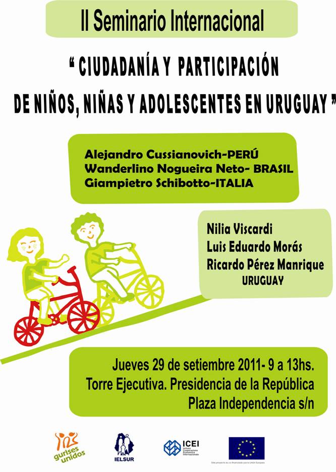 Este Seminario es la actividad de cierre del proyecto “Desde los 20 años de la Convención sobre los Derechos del Niño”, co‐ejecutado por Gurises Unidos, IELSUR y la ONG italiana ICEI, con el apoyo de la Unión Europea. A partir de las acciones generadas se buscó contribuir a fortalecer y establecer garantías para la participación de la niñez y la adolescencia en el Uruguay, aportando al mismo tiempo para la construcción e implementación de políticas públicas en la temática.