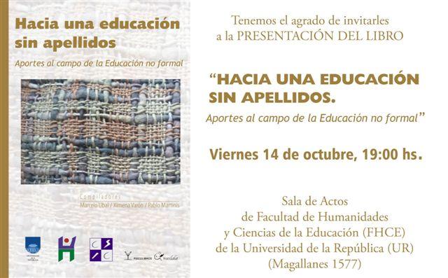 111014 – 14 oct, 19 hs – Presentación del libro «Hacia una educación sin apellidos, Aportes al campo de la Educación no formal»