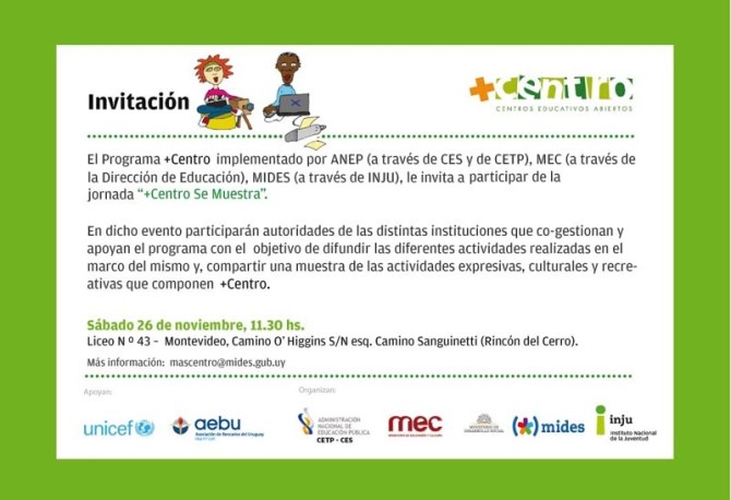 La muestra del programa + Centro, tendrá lugar el sábado 26 de noviembre a la hora 11:30 en el liceo Nº43 (Camino O`Higgins s/n, esq. Camino Sanguinetti, Rincón del Cerro).