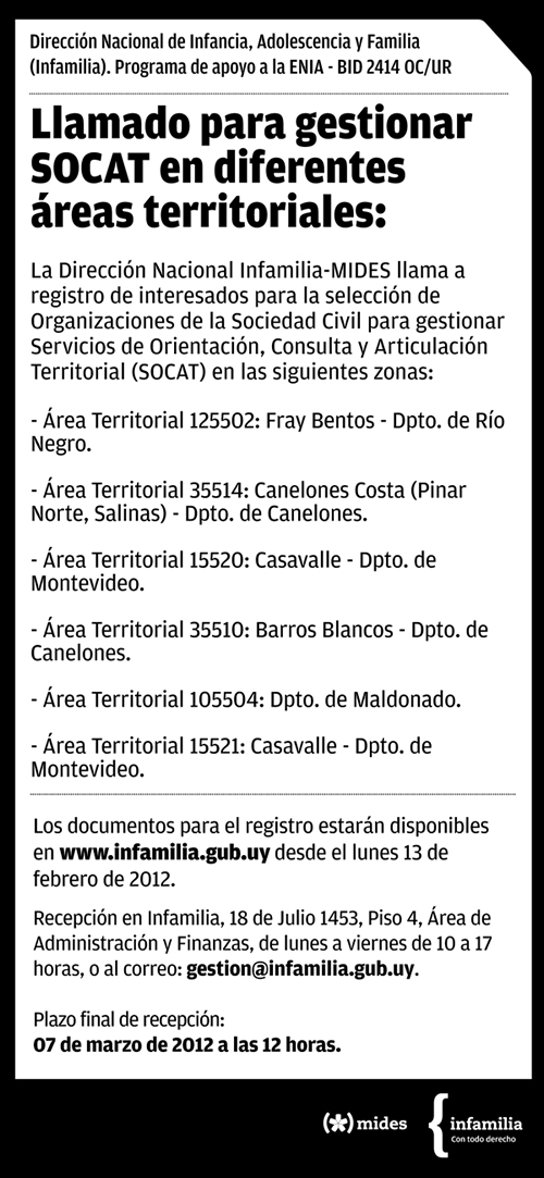 120307 – hasta 7 de marzo – Llamado para gestionar SOCAT en diferentes areas territoriales Publicado el febrero 14, 2012 por Vida y Educación Bases del registro: http://www.box.com/s/tz0itd99pd3f11xo0f2d Comparte esto: Compartir en LinkedIn (Se abre en una ventana nueva) LinkedIn Comparte en Facebook (Se abre en una ventana nueva) Facebook Imprimir (Se abre en una ventana nueva) Imprimir Enviar un enlace a un amigo por correo electrónico (Se abre en una ventana nueva) Correo electrónico Me gusta Cargando... Relacionado