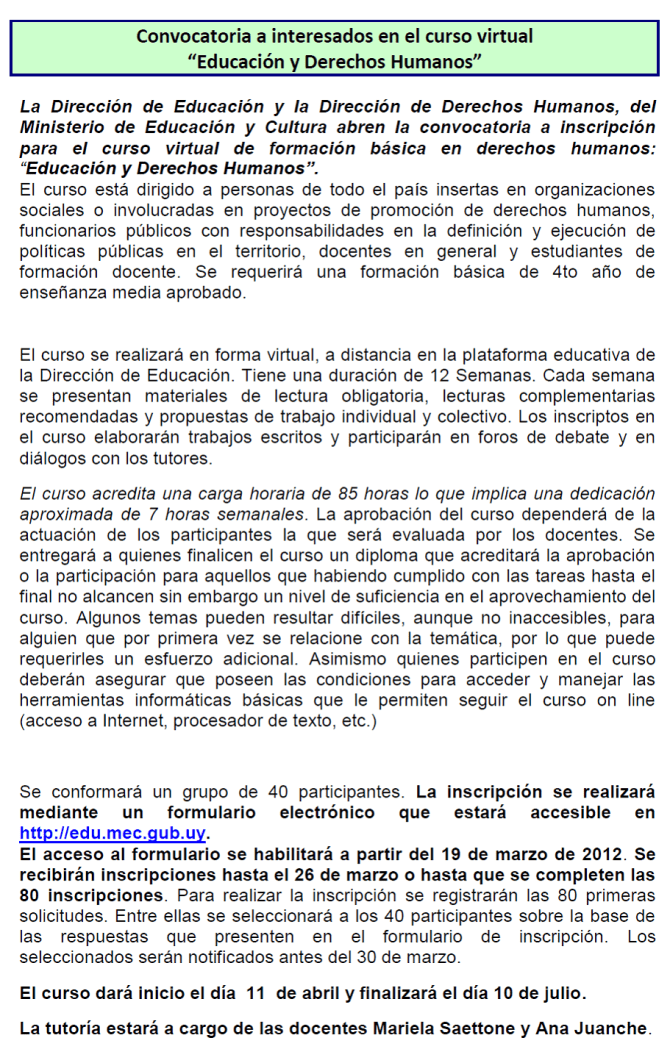 120323 – hasta 23 marzo – Convocatoria a interesados en curso virtual «Educación y Derechos Humanos»