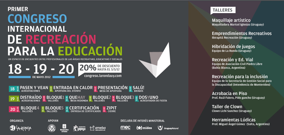 afiche_digital_ Publicado abril 20, 2012 en 929 × 443 en 110420 – Primer Congreso Internacional de Recreación para la Educación- La Ronda Comparte esto: Compartir en LinkedIn (Se abre en una ventana nueva) LinkedIn Comparte en Facebook (Se abre en una ventana nueva) Facebook Imprimir (Se abre en una ventana nueva) Imprimir Enviar un enlace a un amigo por correo electrónico (Se abre en una ventana nueva) Correo electrónico Me gusta Cargando...