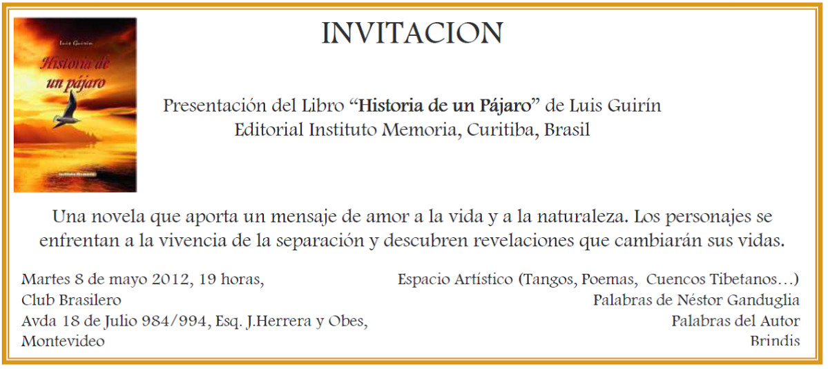 Publicado mayo 2, 2012 en 1268 × 566 en 120508 – 8 mayo, 19 hs – Luis Guirín te invita a la presentación de su Libro “Historia de un Pájaro”