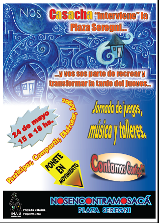 casacha Plaza Seregni Publicado mayo 22, 2012 en 324 × 455 en 120524 – 24 mayo, 15 a 18 hs – CASACHA «interviene» la Plaza Seregni Comparte esto: Compartir en LinkedIn (Se abre en una ventana nueva) LinkedIn Comparte en Facebook (Se abre en una ventana nueva) Facebook Imprimir (Se abre en una ventana nueva) Imprimir Enviar un enlace a un amigo por correo electrónico (Se abre en una ventana nueva) Correo electrónico Me gusta Cargando...