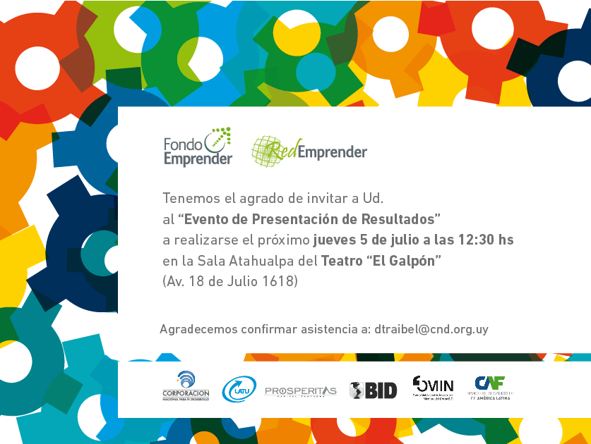 invitacionResultados Publicado julio 3, 2012 en 837 × 630 en 120705 – 5 julio, 12:30 hs – Evento de Presentacion de Resultados de la «Red Emprender» Comparte esto: Compartir en LinkedIn (Se abre en una ventana nueva) LinkedIn Comparte en Facebook (Se abre en una ventana nueva) Facebook Imprimir (Se abre en una ventana nueva) Imprimir Enviar un enlace a un amigo por correo electrónico (Se abre en una ventana nueva) Correo electrónico Me gusta Cargando...