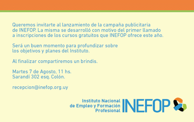 120807 – 7 agosto, 11 hs – Lanzamiento campaña publicitaria de INEFOP Publicado el agosto 6, 2012 por Vida y Educación Comparte esto: Compartir en LinkedIn (Se abre en una ventana nueva) LinkedIn Comparte en Facebook (Se abre en una ventana nueva) Facebook Imprimir (Se abre en una ventana nueva) Imprimir Enviar un enlace a un amigo por correo electrónico (Se abre en una ventana nueva) Correo electrónico Me gusta Cargando... Relacionado