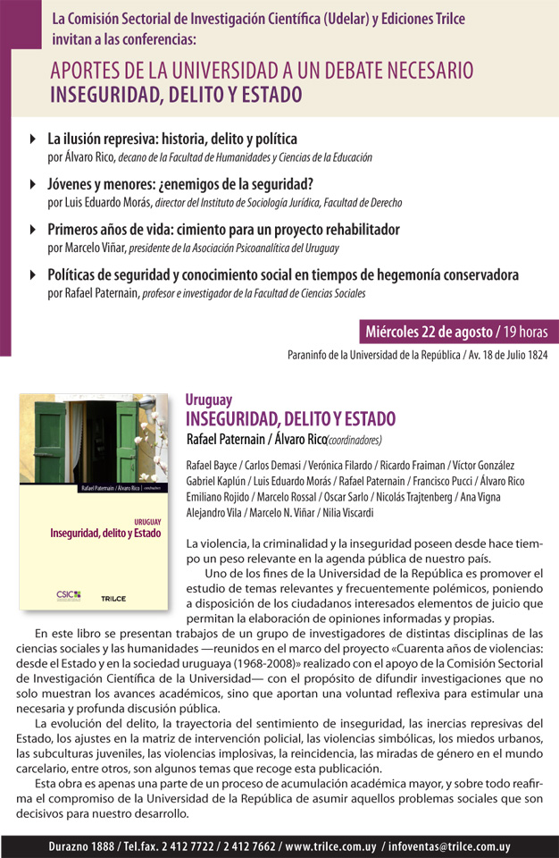 Datos adjuntos sin título 000041 Publicado agosto 14, 2012 en 626 × 960 en 120822 – 22 agosto, 19 hs – Aportes de la Universidad a un debate necesario: Inseguridad, Delito y Estado Comparte esto: Compartir en LinkedIn (Se abre en una ventana nueva) LinkedIn Comparte en Facebook (Se abre en una ventana nueva) Facebook Imprimir (Se abre en una ventana nueva) Imprimir Enviar un enlace a un amigo por correo electrónico (Se abre en una ventana nueva) Correo electrónico Me gusta Cargando...