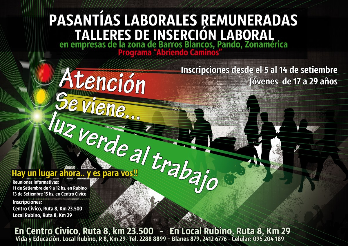Publicado septiembre 1, 2012 en 3508 × 2480 en 120914 – hasta 14 setiembre – «Abriendo Caminos» convoca a jóvenes para Pasantías Remuneradas y Talleres de Inserción Laboral en Barros Blancos