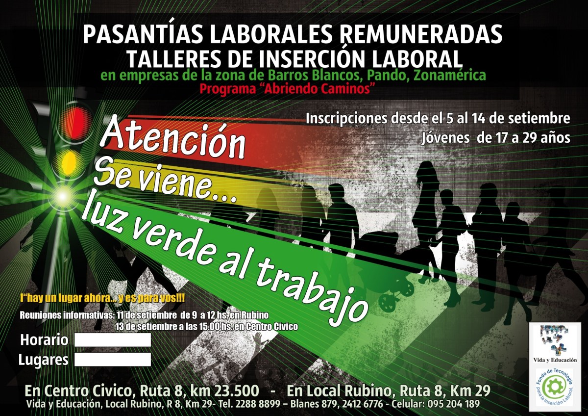 projoven afiche chico 3 Publicado agosto 29, 2012 en 1754 × 1240 en 120914 – hasta 14 setiembre – «Abriendo Caminos» convoca a jóvenes para Pasantías Remuneradas y Talleres de Inserción Laboral en Barros Blancos ← Anterior Siguiente → Comparte esto: Compartir en LinkedIn (Se abre en una ventana nueva) LinkedIn Comparte en Facebook (Se abre en una ventana nueva) Facebook Imprimir (Se abre en una ventana nueva) Imprimir Enviar un enlace a un amigo por correo electrónico (Se abre en una ventana nueva) Correo electrónico Me gusta Cargando...