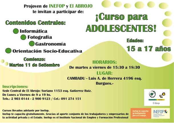 Publicado septiembre 1, 2012 en 610 × 431 en 120911 – desde 11 set – INEFOP y EL ABROJO: Curso para adolescentes 15 a 17 años
