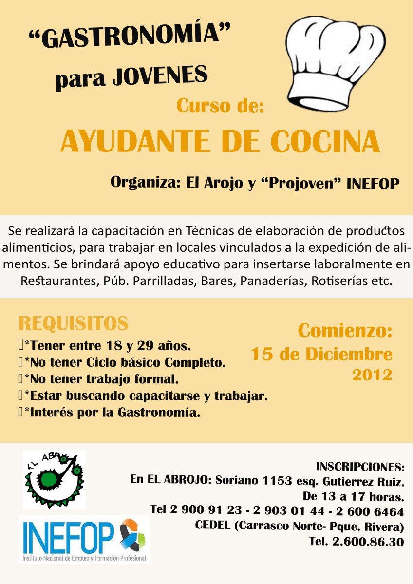 Publicado noviembre 13, 2012 en 2480 × 3508 en 121215 – EL “El Abrojo”, junto a “PROJOVEN”- INEFOP informan que abrirán las inscripciones para el curso de AYUDANTE DE COCINA