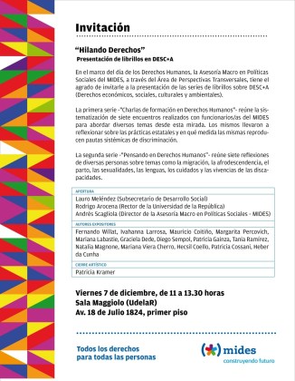 En el marco del día de los Derechos Humanos, la Asesoría Macro en Políticas Sociales del MIDES, a través del Área de Perspectivas Transversales, tiene el agrado de invitarle a la presentación de las series de librillos sobre DESC+A (Derechos económicos, sociales, culturales y ambientales).