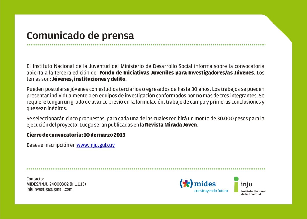 Publicado diciembre 22, 2012 en 2397 × 1712 en 130310 – hasta 10 marzo 2013 – Convocatoria Fondo Iniciativas Juveniles para investigadores jóvenes