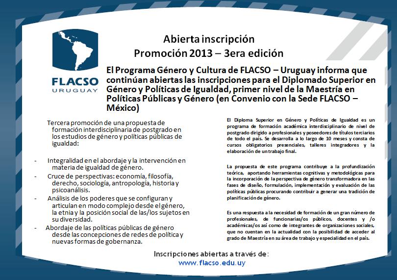 flacso 2013 Politicas Género Publicado febrero 26, 2013 en 810 × 571 en 130308 – hasta 8 marzo – Inscripciones para Maestría Virtual en Género, Sociedad y Políticas, FLACSO ← Anterior Comparte esto: Compartir en LinkedIn (Se abre en una ventana nueva) LinkedIn Comparte en Facebook (Se abre en una ventana nueva) Facebook Imprimir (Se abre en una ventana nueva) Imprimir Enviar un enlace a un amigo por correo electrónico (Se abre en una ventana nueva) Correo electrónico Me gusta Cargando...