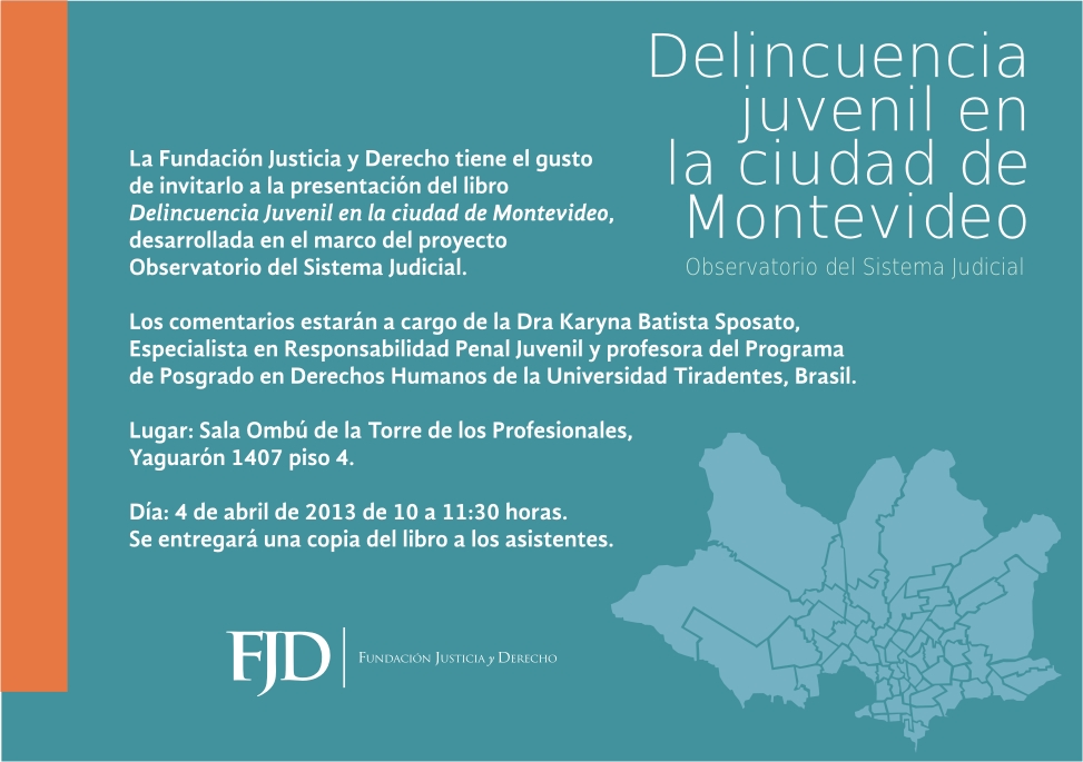 Invitacion4 Publicado marzo 23, 2013 en 973 × 685 en 130404 – 4 abril, 10:30 hs – Presentación del libro Delincuencia Juvenil en la Ciudad de Montevideo – Fundación Justicia y Derecho Comparte esto: Compartir en LinkedIn (Se abre en una ventana nueva) LinkedIn Comparte en Facebook (Se abre en una ventana nueva) Facebook Imprimir (Se abre en una ventana nueva) Imprimir Enviar un enlace a un amigo por correo electrónico (Se abre en una ventana nueva) Correo electrónico Me gusta Cargando...