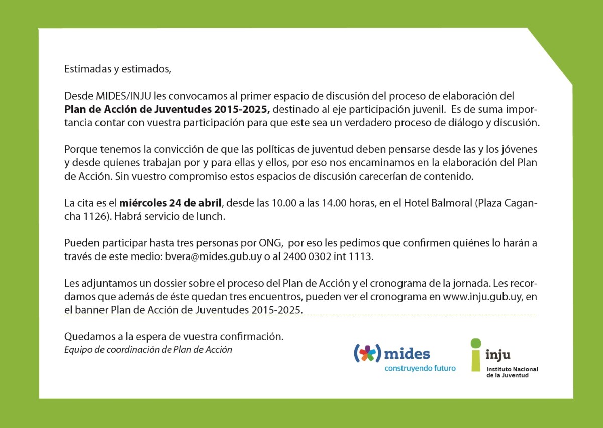 Publicado abril 20, 2013 en 1486 × 1055 en 130424 – 24 abril, 10 a 14 hs – INJU invita a ONG para la elaboración del Plan de Acción Juventudes 2015-2025