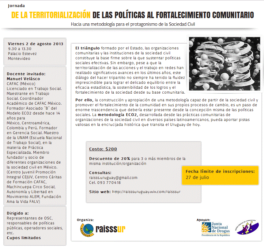 Publicado julio 25, 2013 en 862 × 808 en 130802 – 2 agosto, 9:30 a 13:30 – Jornada de RAISSUR: «De la territorialización de las políticas al fortalecimiento comunitario»