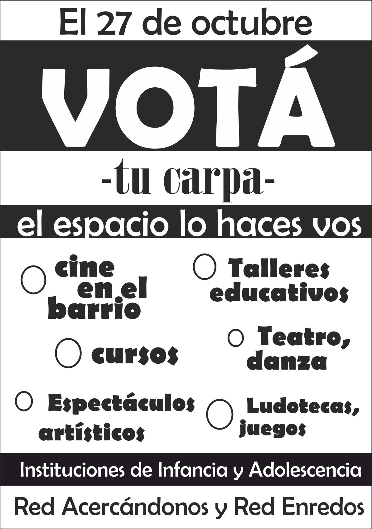 afiche frente3 Publicado octubre 1, 2013 en 1193 × 1696 en 131027 – Vida y Educación con Redes ENREDOS y ACERCÁNDONOS: El 27 de octubre VOTÁ TU CARPA en el Presupuesto Participativo ← Anterior Siguiente → Comparte esto: Compartir en LinkedIn (Se abre en una ventana nueva) LinkedIn Comparte en Facebook (Se abre en una ventana nueva) Facebook Imprimir (Se abre en una ventana nueva) Imprimir Enviar un enlace a un amigo por correo electrónico (Se abre en una ventana nueva) Correo electrónico Me gusta Cargando...