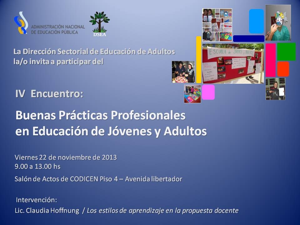 Publicado noviembre 21, 2013 en 960 × 720 en 131122 – 22 Noviembre, de 9 a 13 hs – IV Encuentro «Buenas Prácticas Profesionales en Educación de Jóvenes y Adultos»