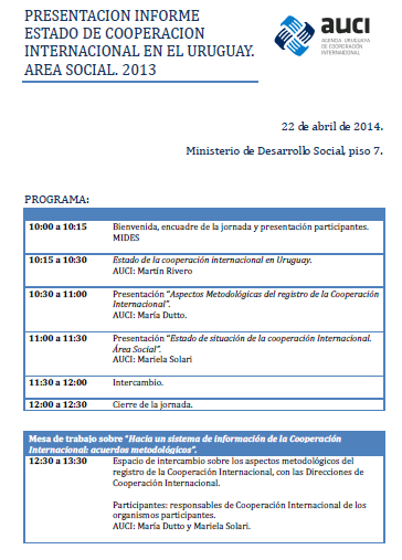 Publicado abril 22, 2014 en 364 × 507 en 140422 – 22 abril, 10 hs – AUCI: Presención de Informe «Estado de cooperación internacional en Uruguay, Area social 2013