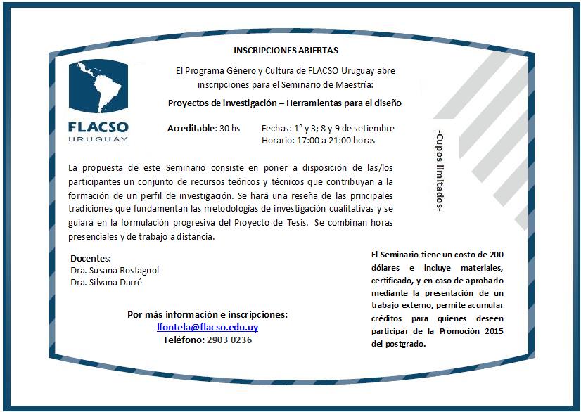 Publicado agosto 13, 2014 en 826 × 586 en 140901 – 1, 3, 8 y 9 setiembre, 17 a 21 hs – Seminario FLACSO: Proyectos de Investigación – Herramientas para el diseño
