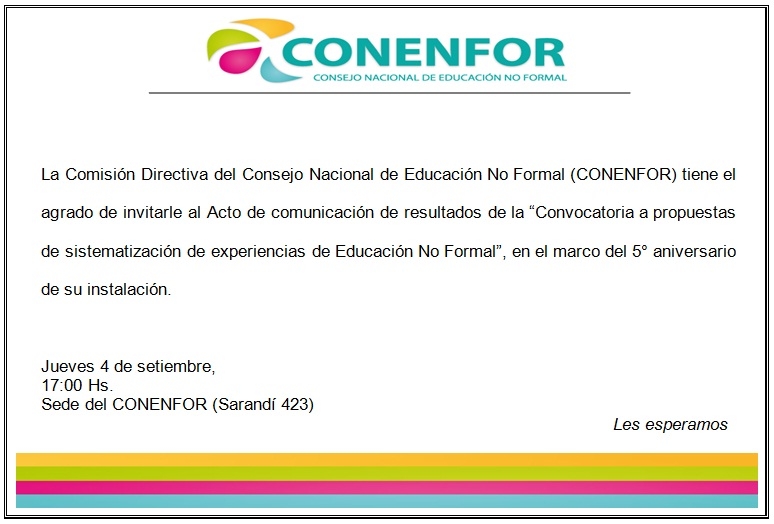 Publicado agosto 30, 2014 en 774 × 524 en 140904 – 4 setiembre, 17 hs – Conenfor: Acto de comunicación de resultados de la Convocatoria a propuestas de sistematización