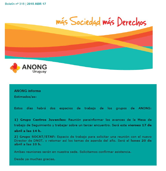 anong boletin 316 Publicado abril 17, 2015 en 548 × 565 en 150417 – ANONG: Boletín nº 316 | 2015 ABR 17 ← Anterior Comparte esto: Compartir en LinkedIn (Se abre en una ventana nueva) LinkedIn Comparte en Facebook (Se abre en una ventana nueva) Facebook Imprimir (Se abre en una ventana nueva) Imprimir Enviar un enlace a un amigo por correo electrónico (Se abre en una ventana nueva) Correo electrónico Me gusta Cargando...