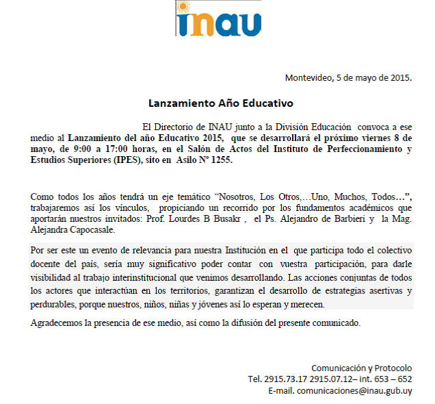 Publicado mayo 7, 2015 en 636 × 590 en 150508 – 8 mayo, 9 a 17 hs – INAU: Lanzamiento del año Educativo 2015