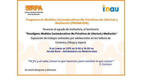 Publicado junio 4, 2015 en 467 × 271 en 150609 – 9 junio. 9 a 16 hs – SIRPA: Seminario «Paradigma: Medidas socioeducativas No Privativas de Libertad y Mediación»