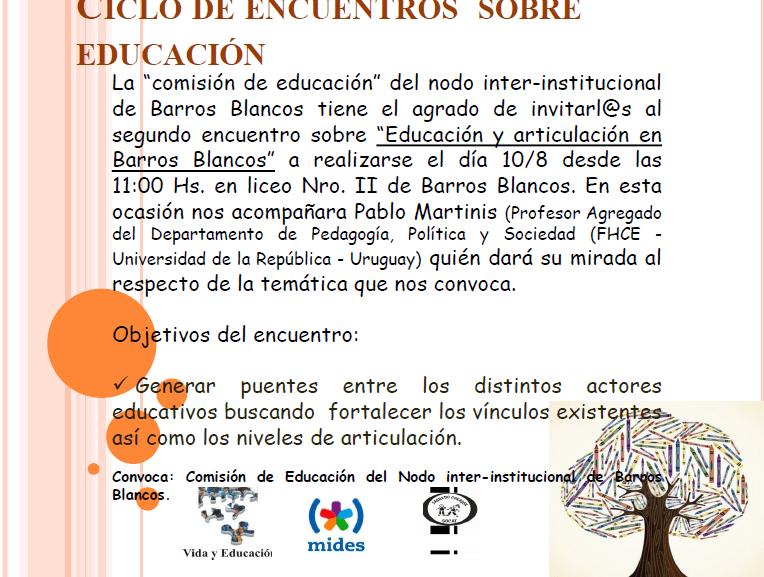ciclo de encuentros educ n2 Publicado agosto 7, 2015 en 764 × 577 en 150810 – 10 agosto, 11 hs – Segundo encuentro sobre “Educación y articulación en Barros Blancos” , con Pablo Martinis Comparte esto: Compartir en LinkedIn (Se abre en una ventana nueva) LinkedIn Comparte en Facebook (Se abre en una ventana nueva) Facebook Imprimir (Se abre en una ventana nueva) Imprimir Enviar un enlace a un amigo por correo electrónico (Se abre en una ventana nueva) Correo electrónico Me gusta Cargando...
