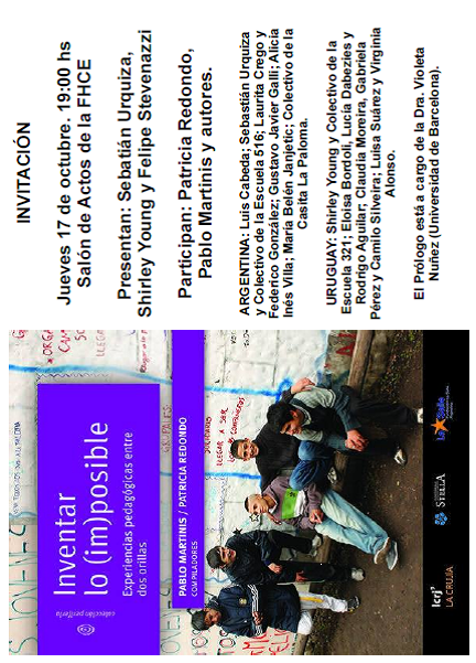Inventar lo (im)posible oct2015 Publicado octubre 8, 2015 en 432 × 601 en 151017 – 17 octubre, 19 hs – FHCE: Presentación del libro «Inventar lo (im)posible» Siguiente → Comparte esto: Compartir en LinkedIn (Se abre en una ventana nueva) LinkedIn Comparte en Facebook (Se abre en una ventana nueva) Facebook Imprimir (Se abre en una ventana nueva) Imprimir Enviar por correo electrónico un enlace a un amigo (Se abre en una ventana nueva) Correo electrónico Me gusta Cargando...