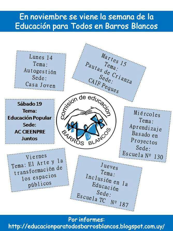 img-20161105-wa0006 Publicado noviembre 5, 2016 en 668 × 890 en 161114 – 14 al 19 noviembre – Semana de la Educación de Barros Blancos ← Anterior Comparte esto: Compartir en LinkedIn (Se abre en una ventana nueva) LinkedIn Comparte en Facebook (Se abre en una ventana nueva) Facebook Imprimir (Se abre en una ventana nueva) Imprimir Enviar un enlace a un amigo por correo electrónico (Se abre en una ventana nueva) Correo electrónico Me gusta Cargando...