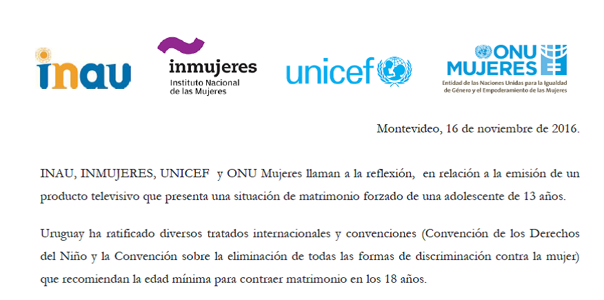 Publicado noviembre 17, 2016 en 876 × 435 en 161116 – INAU, UNICEF y ONU MUJERES llaman a la reflexión en relación a la emisión de un programa televisivo