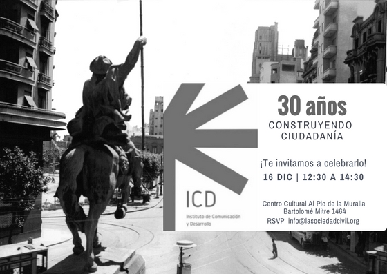 invitacion-30-anos Publicado diciembre 2, 2016 en 560 × 397 en 161216 – 16 diciembre, 12:30 a 14:30 hs – ICD: 30 años construyendo ciudadanía Comparte esto: Compartir en LinkedIn (Se abre en una ventana nueva) LinkedIn Comparte en Facebook (Se abre en una ventana nueva) Facebook Imprimir (Se abre en una ventana nueva) Imprimir Enviar un enlace a un amigo por correo electrónico (Se abre en una ventana nueva) Correo electrónico Me gusta Cargando...