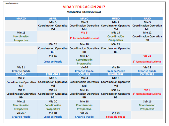 170317 – Calendario tentativo de actividades institucionales 2017 de VIDA Y EDUCACION Publicado el marzo 20, 2017 por Vida y Educación Descargar calendarios: VYE Calendario anual 2017 v1 CUADRO VYE Calendario anual 2017 v1 vertical VYE Calendario anual 2017 v1 HORIZONTAL Comparte esto: Haz clic para compartir en LinkedIn (Se abre en una ventana nueva) LinkedIn Haz clic para compartir en Facebook (Se abre en una ventana nueva) Facebook Haz clic para imprimir (Se abre en una ventana nueva) Imprimir Haz clic para enviar un enlace por correo electrónico a un amigo (Se abre en una ventana nueva) Correo electrónico Me gusta Cargando... Relacionado