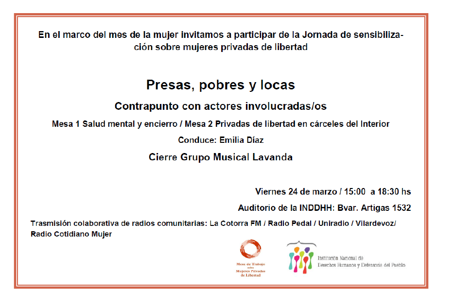 Publicado marzo 20, 2017 en 934 × 634 en 170324 – 24 marzo, 15 a 18:30 hs – INDDHH, MNP – Jornada de sensibilización sobre mujeres privadas de libertad